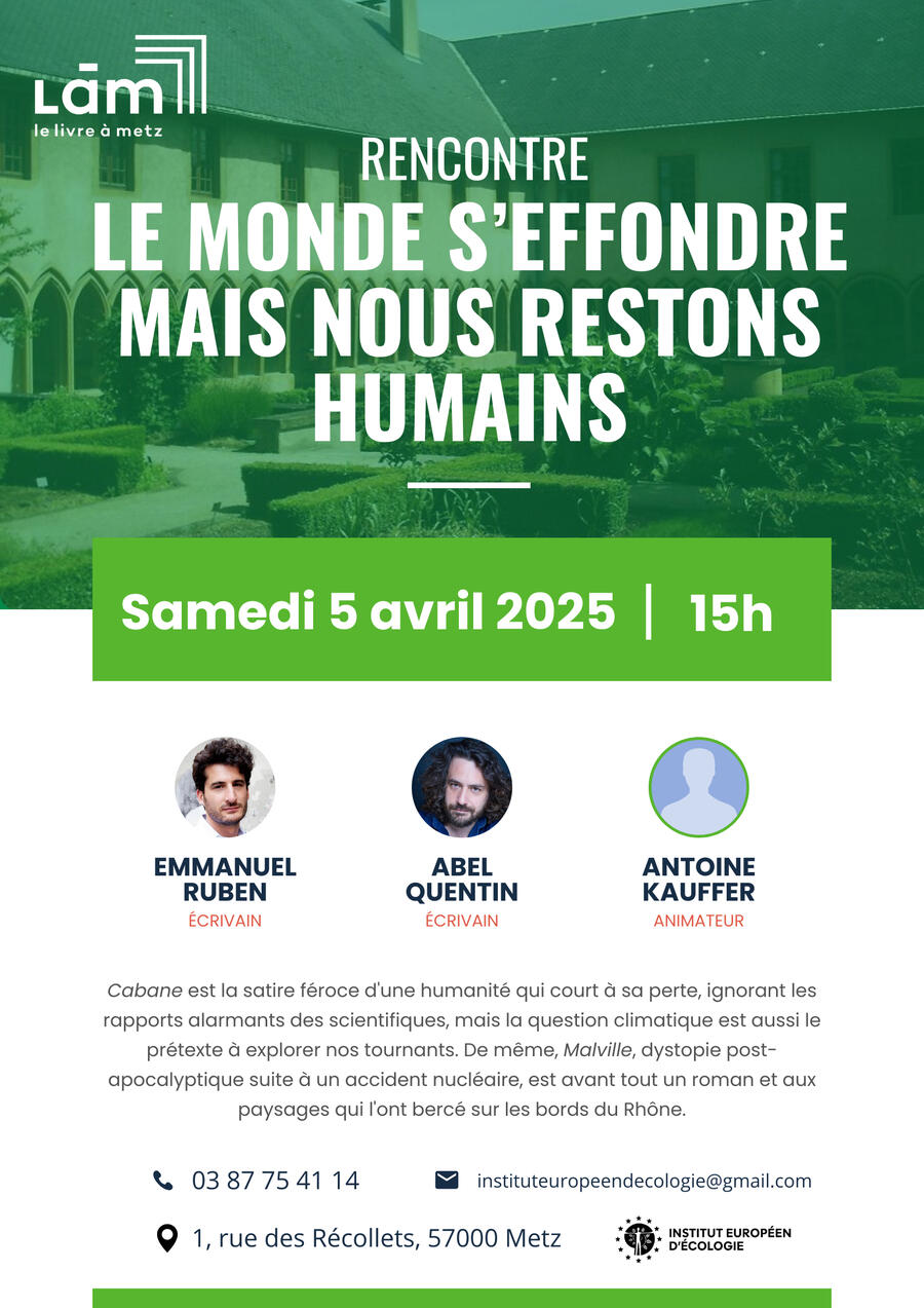 Avec Emmanuel Ruben (Malville, Stock) et Abel Quentin (Cabane, L’Observatoire), animée par Antoine Kauffer. En partenariat avec l’Institut Européen d’Écologie.